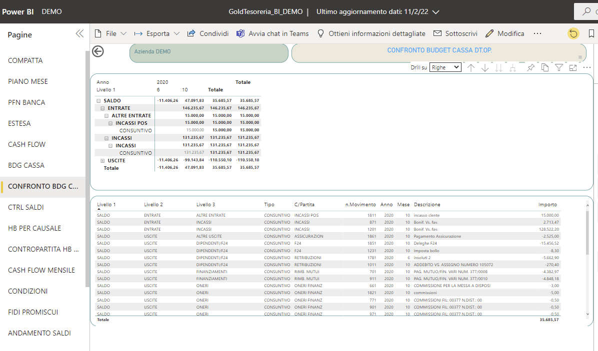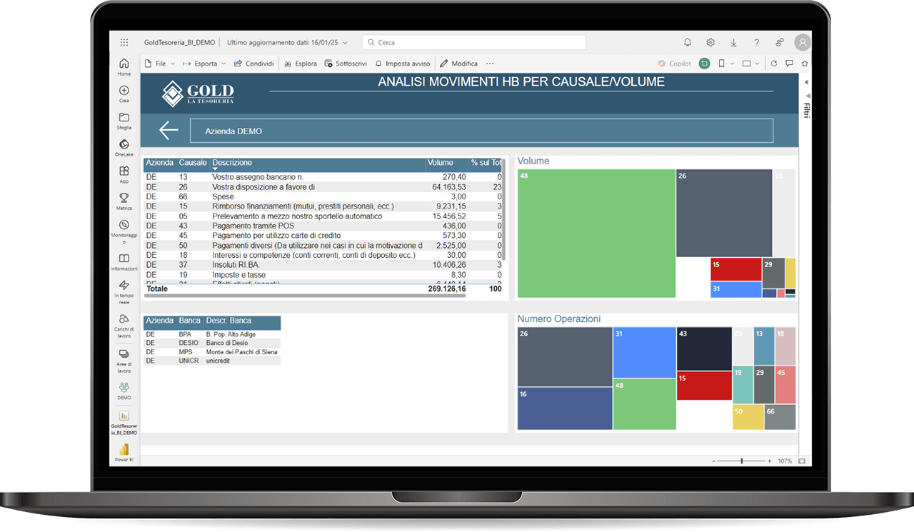 Il team tecnico di GOLD La Tesoreria ha sviluppato in tecnologia Microsoft Power BI dei cruscotti di BI che, prendendo i dati direttamente da GOLD, li rende fruibili con tutti i vantaggi tipici della Business Intelligence (potenzialità grafica, possibilità di navigare ‘dentro’ ai numeri, fruibilità anche in mobilità e fuori dall’azienda … ).