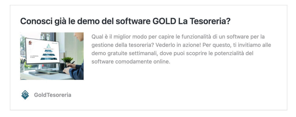 Per questo abbiamo attivato un ciclo di demo online, dove puoi comprendere come il software Gold La Tesoreria può aiutarti a migliorare sia la gestione del cash flow, che la gestione finanziaria nel suo insieme.