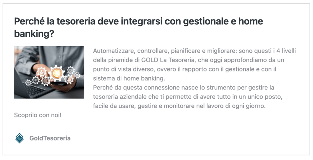 Ma attenzione, perché possa realmente ‘servire’ all’impresa è necessario che la gestione della tesoreria si integri con i gestionali in uso e con l’home banking. Come farlo in modo automatico? Ne parliamo in questo articolo.
