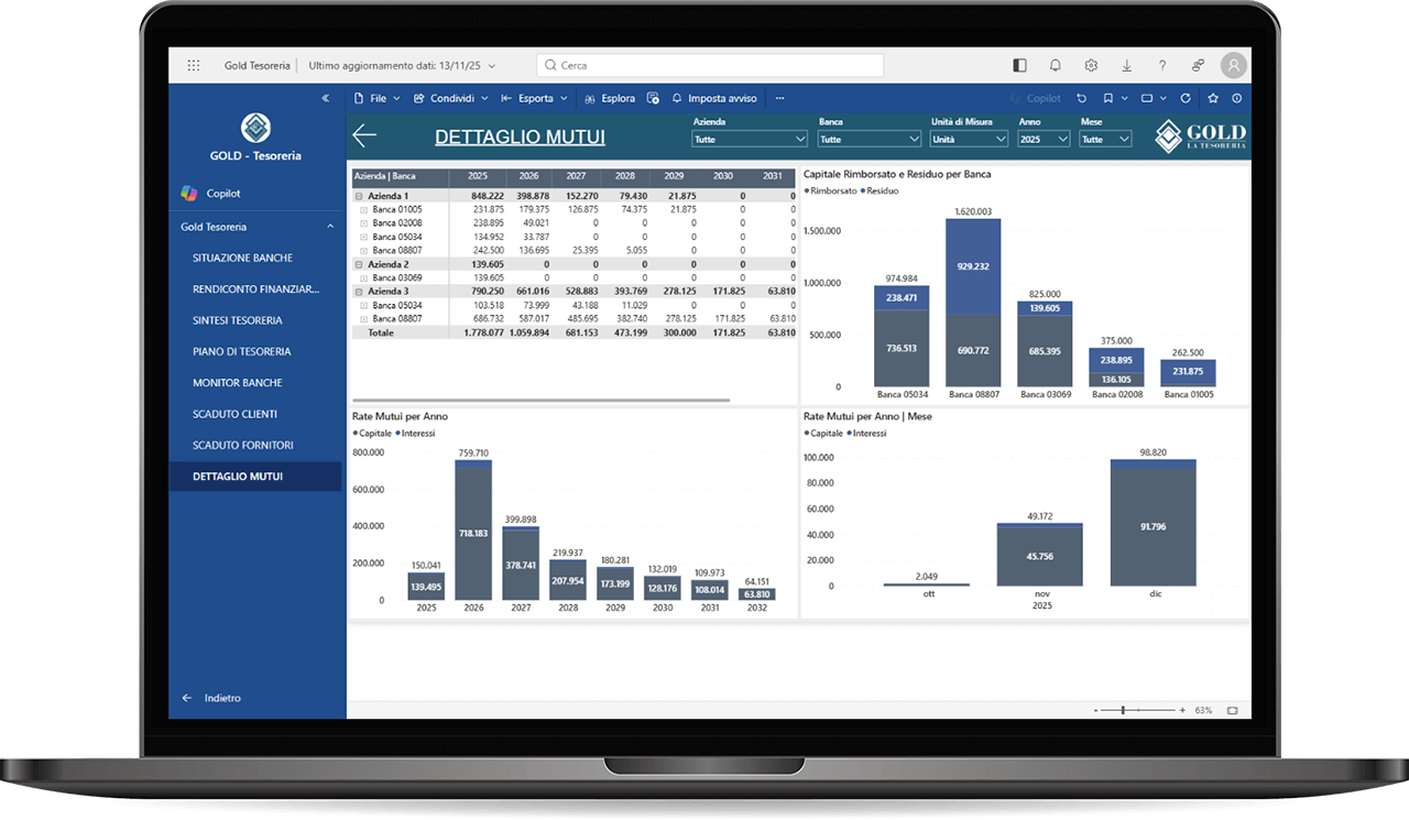 Il cruscotto mostra i saldi dei mutui per banca e per azienda, con una visione sull’anno in corso e sugli anni futuri. Consente di analizzare quanto è già stato rimborsato e il residuo da rientrare, offrendo una chiara lettura dell’esposizione finanziaria.