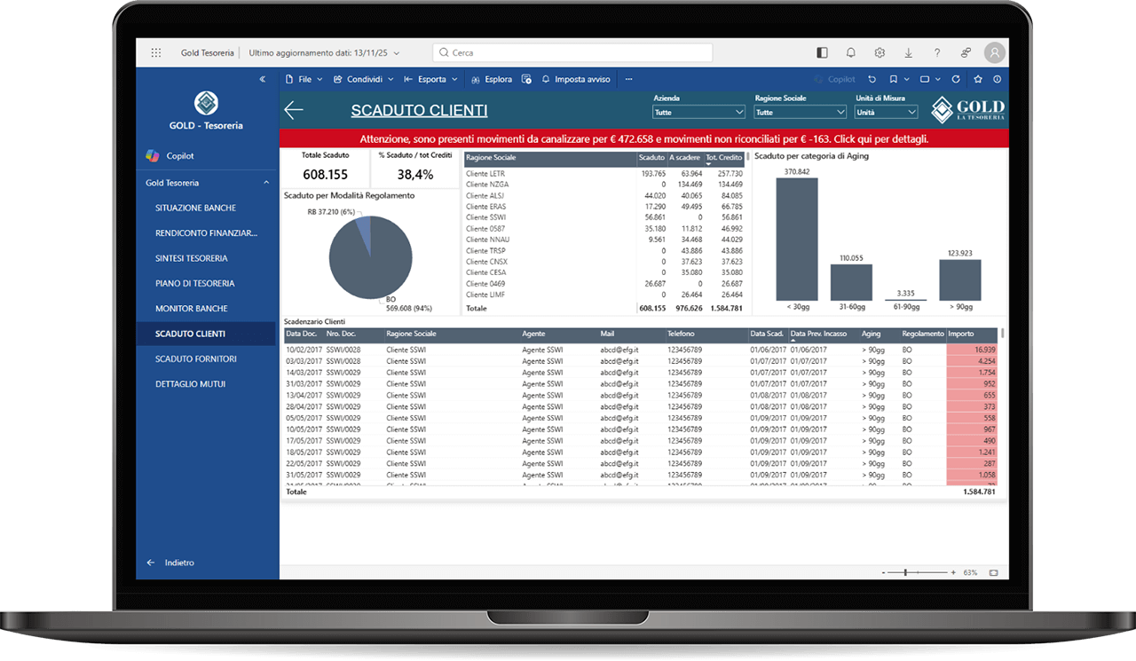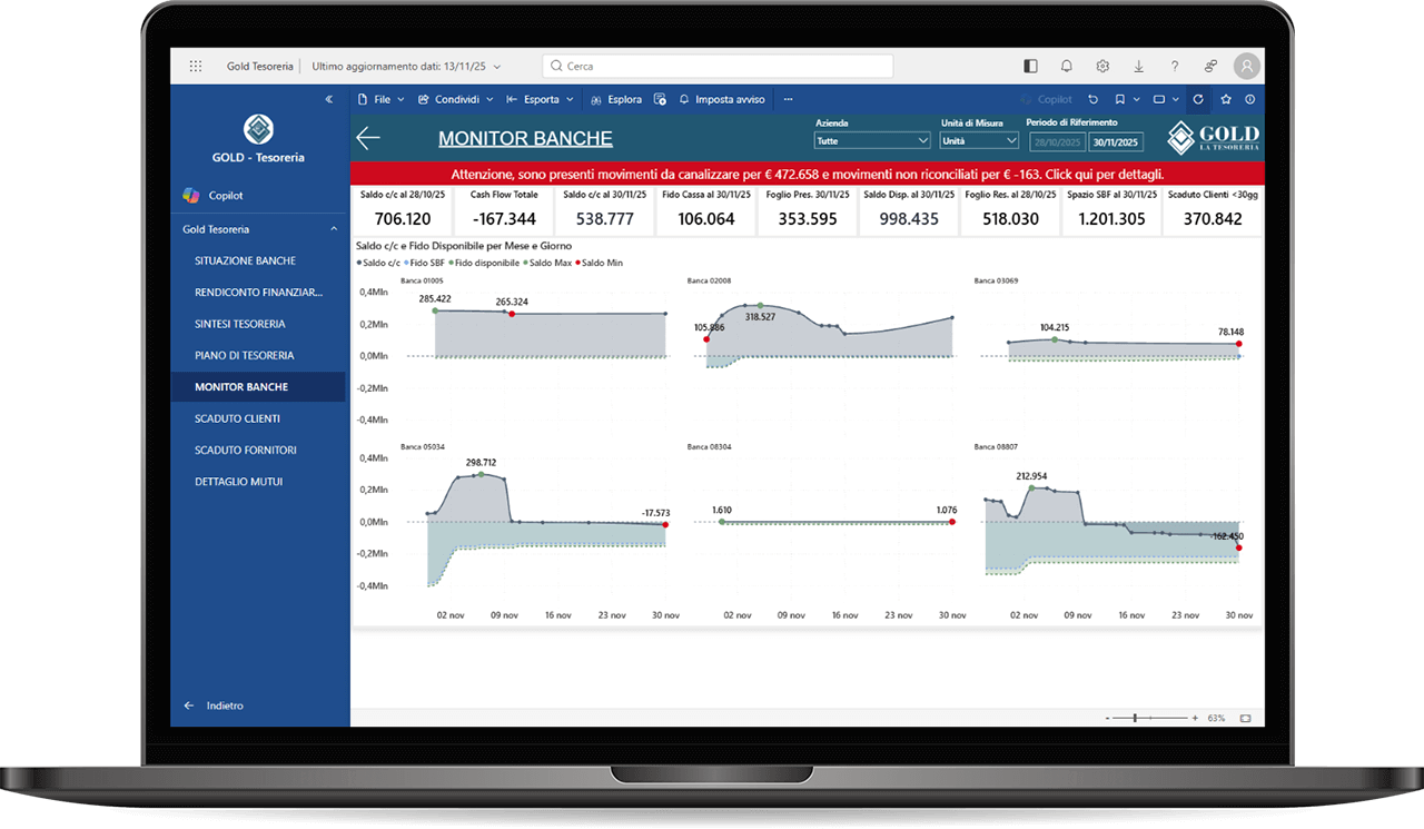 Attraverso le analisi potrai avere ad esempio: una visione costante e aggiornata dei saldi bancari, monitorare l’esposizione verso ciascuna banca, analizzare l’andamento dei flussi di cassa, disporre di report oggettivi e coerenti.