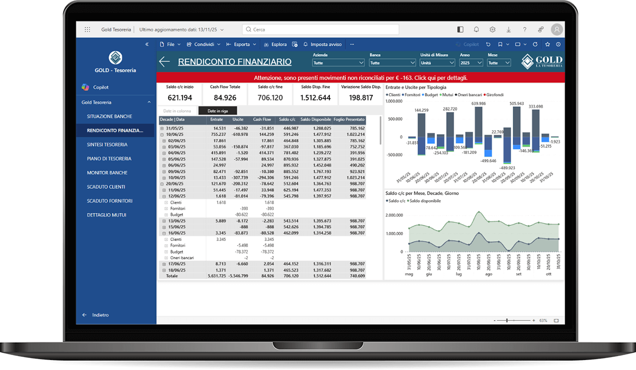 Il cruscotto mostra l’andamento dei flussi finanziari in un preciso arco temporale, con filtro per mese e scomposizione dei movimenti per decade. La vista consente di costruire un rendiconto finanziario diretto, analizzando il flusso di cassa operativo e valutando la sostenibilità delle scelte di finanziamento.